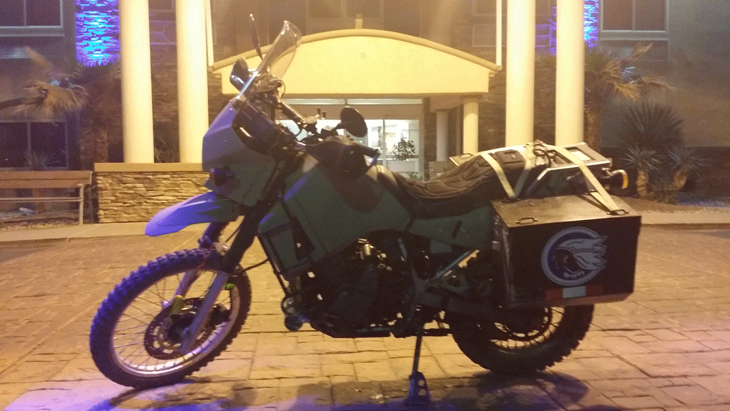 The motorcycle I'm riding is a Kawasaki KLR650 and can be called a "dual sport" motorcycle, which essentially means I can ride on and off road. A modified version (not much differently modified than mine) is currently used in service by the Reconnaissance Marines of the US Marine Corps. The KLR650 has a small, but fanatical following for its proven reputation. First of all, it is incredibly cheap; for less than a quarter of the cost of a brand new BMW adventure bike you can have what is essentially the AK-47 of motorcycles. The KLR650 is simple and reliable, yet rugged, sporting a thumping single-cylinder 650cc engine, and can found all over the world. Thanks to its popularity and commonness, replacement parts can be found much more easily for the KLR650 whether you are in Denali Alaska or Baja California or Tierra del Fuego.